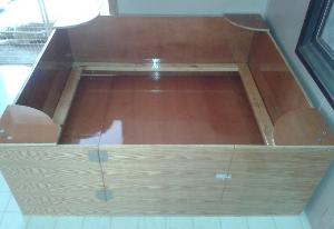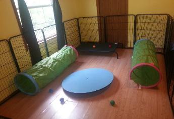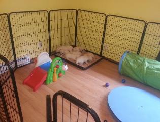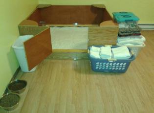 These are our whelping boxes. They are 5ft. by 5ft. and are made out of beautiful Red Oak. The other pictures are of our puppy play/potty training area that each litter grows up in. We of course also have 2 1/2 acres fenced in outside that they enjoy very much as well! |