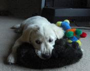 This is Week-End iz Stolicy Urala, "Rush". He is now our new stud. He has an AMAZING sweet temperament and is a very heavy boned strong boy. He is came to us all the way from Russia. His pedigree is packed with amazing dogs. Rush is also an English Golden. He is my "little" cuddle boy and runs with me every day! Thank you Elena!! He is simply a joy. |